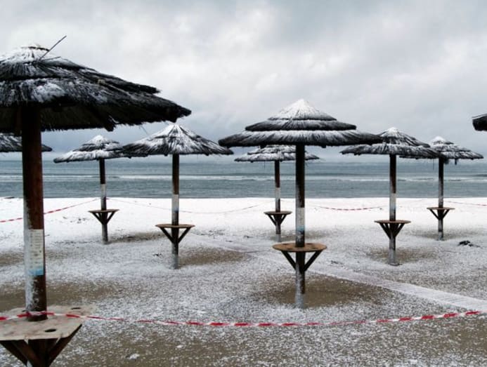On the southern coast, tall palm trees and sunbeds were draped in white.